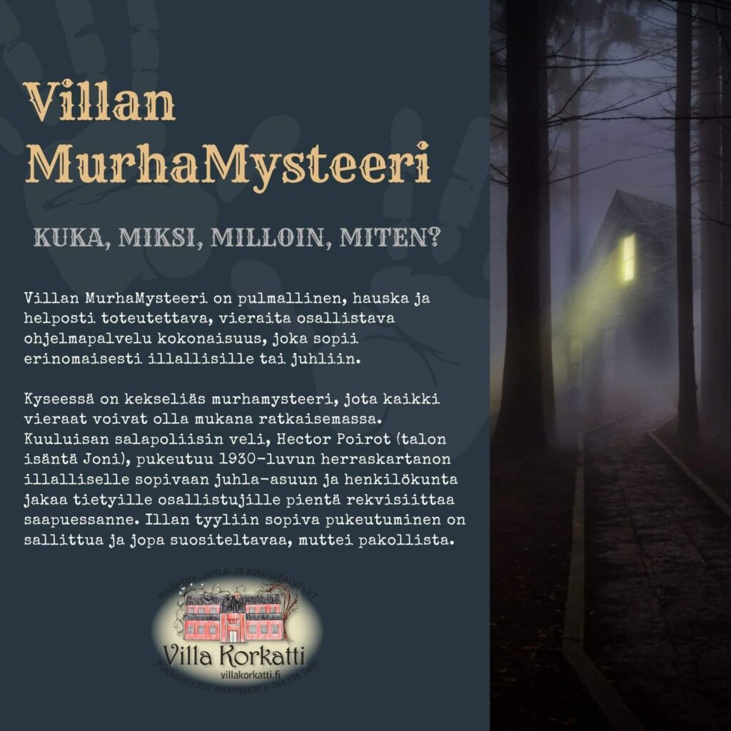 Kyseessä on kekseliäs murhamysteeri, jota kaikki vieraat voivat olla mukana ratkaisemassa. Kuuluisan salapoliisin veli, Hector Poirot (talon isäntä Joni), pukeutuu 1930‑luvun herraskartanon illallisille sopivaan juhla‑asuun ja henkilökunta jakaa tietyille osallistujille pientä rekvisiittaa saapuessanne. Illan tyyliin sopiva pukeutuminen on sallittua ja jopa suositeltavaa, muttei pakollista.